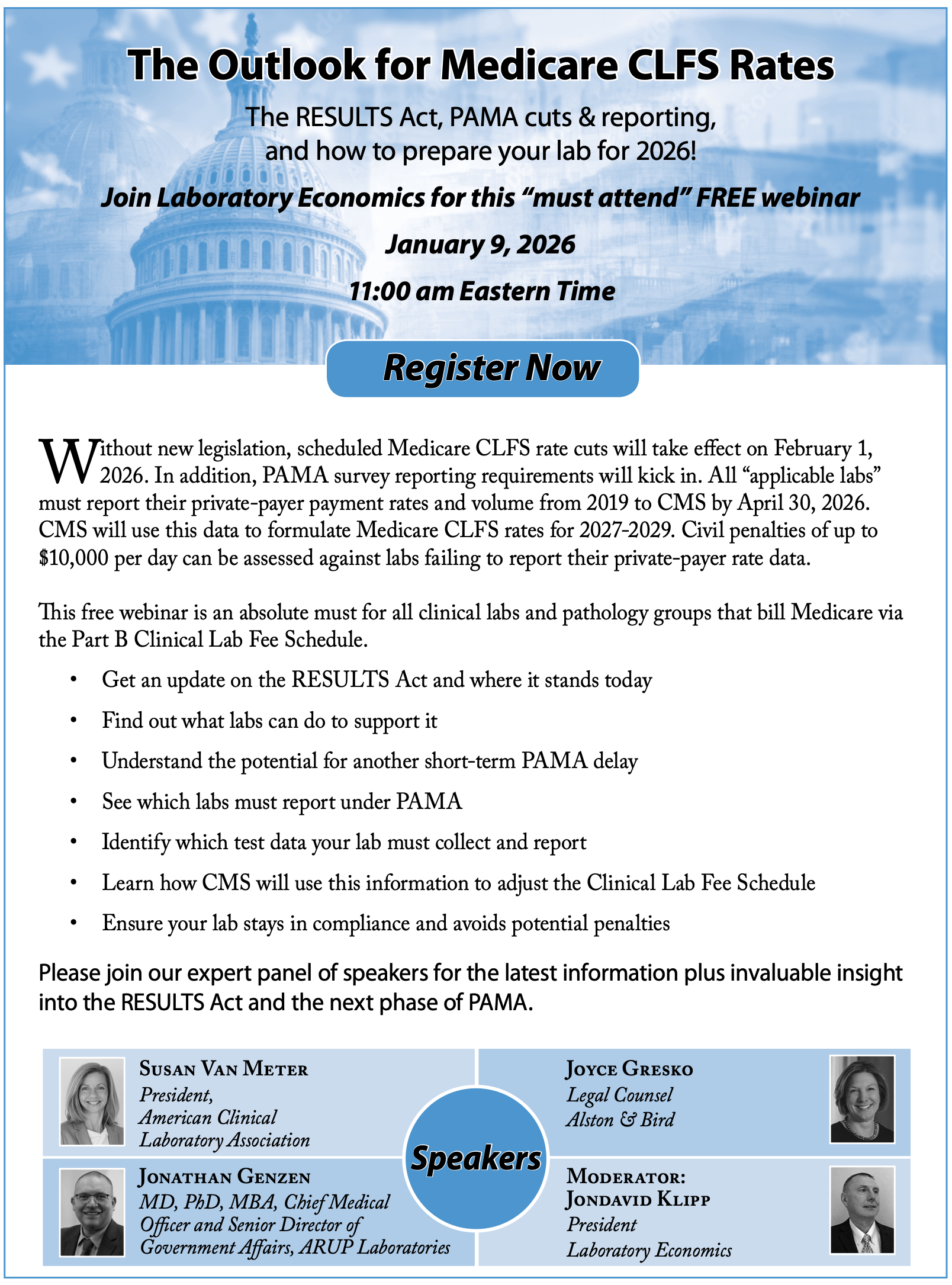 Editor's Welcome: Without Congressional action, scheduled cuts to the Clinical Laboratory Fee Schedule under PAMA will take effect on February 1, 2026. In addition, the next three month reporting period for private-payer rates will begin. Our friend and knowledgeable expert, Jondavid Klipp, President of Laboratory Economics will be moderating a free webinar discussing the outlook for new legislation and possible outcomes.